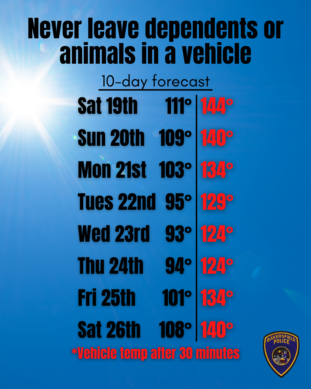 As blistering temperatures continue, the Bakersfield Police Department is issuing a reminder about ...