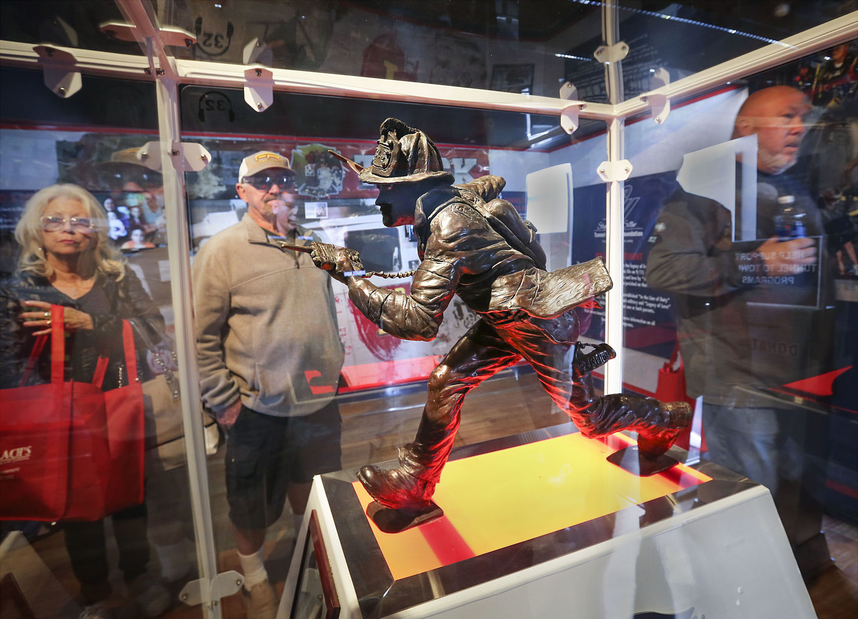 Bakersfield City Firefighter John Zamora shakes the hand of retired FDNY firefighter Bob Sapienza ...