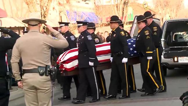 NEWMAN, Calif. (AP) — The flag-draped casket of a California police officer who authorities ...